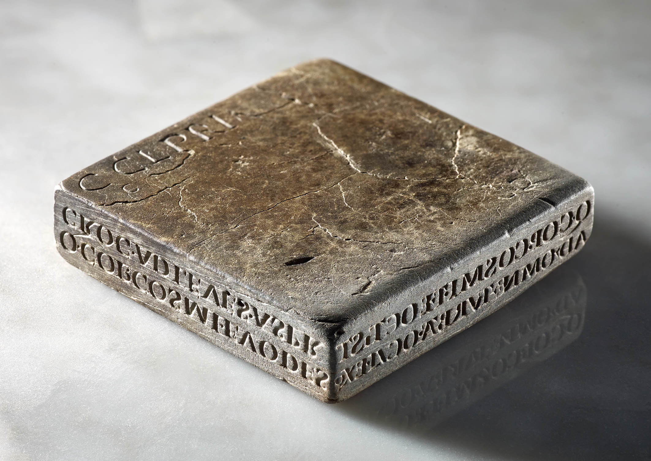 Dieser zweifellos außergewöhnliche Stempel weist zwei Namen auf. Der erste Name, Gaius Claudius Primus, wurde etwas nachlässig in Klarschrift auf der glatten Oberfläche eingeritzt (C CL PRI). Vermutlich handelt es sich um den Besitzer des Stempels und den Bestatteten, der hier nachträglich eine Besitzerinschrift hinterließ. Gaius scheint nicht nur diesen Stempel genutzt, sondern auch mit Erfolg Augensalben vertrieben zu haben. Zumindest liegt ein Stempel mit identischem Namen aus Cessey-sur-Tille in Frankreich vor, auf dem er – im Gegensatz zu dem Heppendorfer Beispiel – auf den Schmalseiten in direktem Zusammenhang mit Augenleiden und Medikamenten genannt wird. Der französische Stempel wurde nahe einer römischen Straße entdeckt. Vermutlich verlor Gaius oder jemand, der seine Augensalbenrezeptur einsetzte, den Stempel während eines Ambulanzeinsatzes in Frankreich.