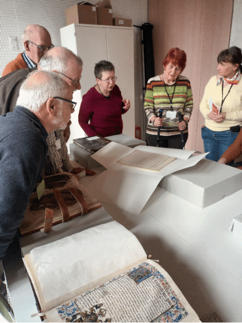 Die an der Führung teilnehmenden Mitglieder erhielten einen exklusiven Einblick und Eindruck in den Archivalltag hinter den Kulissen. So wurden uns die Werkstatträume gezeigt, in denen die durch den Einsturz des alten Archivs beschädigten und/oder verschmutzten Archivalien wie Urkunden, Akten etc. aufbereitet werden und erklärt, wie die zerrissenen Einzelteile wie bei einem Puzzlespiel gereinigt, gescannt und in mühevoller Kleinarbeit wieder zusammengesetzt werden.